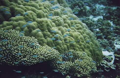 An aerial shot of Fagatele Bay, one of the prime scuba diving and snorkeling spots on the island of Tutuila.