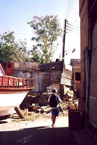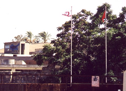 Still in the UN buffer zone, facing the South Cyprus border. Thick coiled barbed wire lines the sides of this road. The UN headquarters building is just visible along the right edge of this picture. The blue & white striped buildings in front of me mark the Greek Cypriot border post. Not seen in this photo is the startled expression of the two Greek guards who practically fell out of their chairs when I approached from behind them. One shouted "Did you just come from the occupied territory?" in a most unwelcoming tone. That was my first indication that I was in an area I had no business being in, so I turned around and scurried back to the north before the Greek soldiers could get too close to me. As "luck" would have it, the young UN soldier from England who let me walk past him to this spot had just been assigned to this border post only the day before and did not yet know that he wasn't supposed to let outsiders pass. His supervisor chewed him out in full view of me.