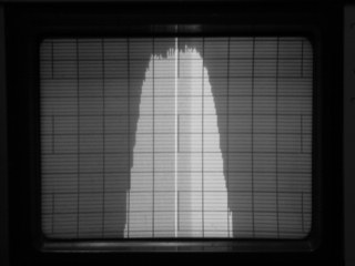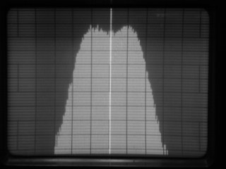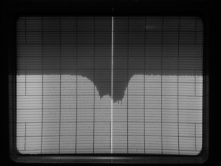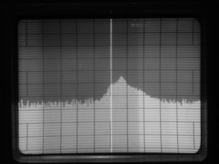 As an example (below) of how critical the adjustment is because the bandwidth is so narrow, the trace on the left is tuned up via the S.A. and the one on the right has the three trimmers less than 1/16 of a turn turn off optimum (vertical scale is 10dB/div, horizontal scale is 500KHz/div, bright vertical line is at roughly the center frequency of 8645KHz). The trace on the left is the one above but the scales are different (10dB/500KHz vs 1dB/200KHz).