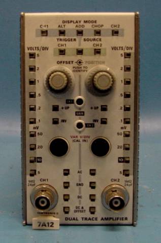 7A12 Dual Trace Amplifier Constant bandwidth for all deflection factors, 5 operating modes, trigger source selectivity, trace OFFSET with +1000 div range, color-keyed control grouping, and a trace IDENTIFY function. Bandwidth: DC to 105MHz Deflection Factor: 5 mV/div to 5 V/div Input R and C: 1 Mohm within 2%; 24 pF within 1 pF for all deflection factors |  |