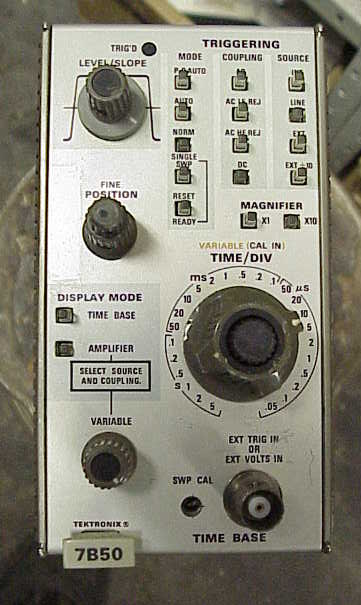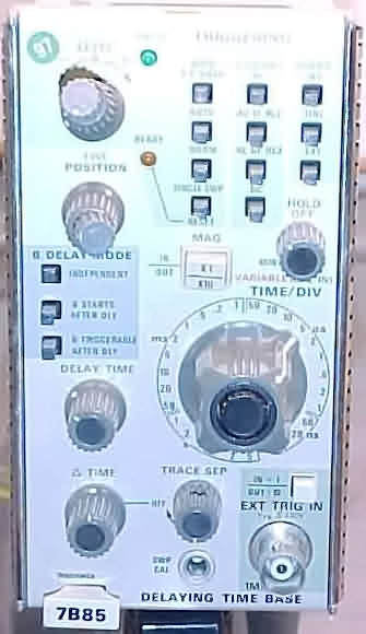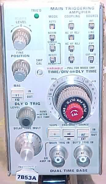 7B53 Dual Time Base triggers to 100MHzhas normal, intensified delaying, delayed, and mixed sweep modesDelaying sweep speeds are 50 ns to 5 s/div in 25 stepsX10 MAG, INT. and EXT. (main & delayed) trigger inputssingle sweepfront-panel Cal and fine/coarse position controlsSlope adjust switch (-/0/+)