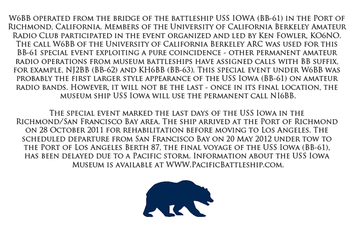 258 logged qso's, check the log here w6bb-uss-iowa12.adi