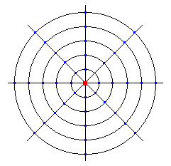 In the drawing below, the red dot is the transmitter. Each circle represents a distance of 2 miles further from the transmitter (2, 4, 6, 8 ,and 10 miles). The lines are at fixed points at 0, 45, 90, 135, 180, 225, 270, and 315 degrees. Add the ground elevations at each blue dot (where the degree lines and mileage circles intersect). Divide that number by 40 to get the average ground elevation.