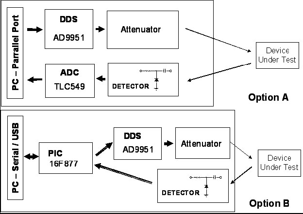 Option B: the DDS unit is driven by a PIC. The program interfaces via the