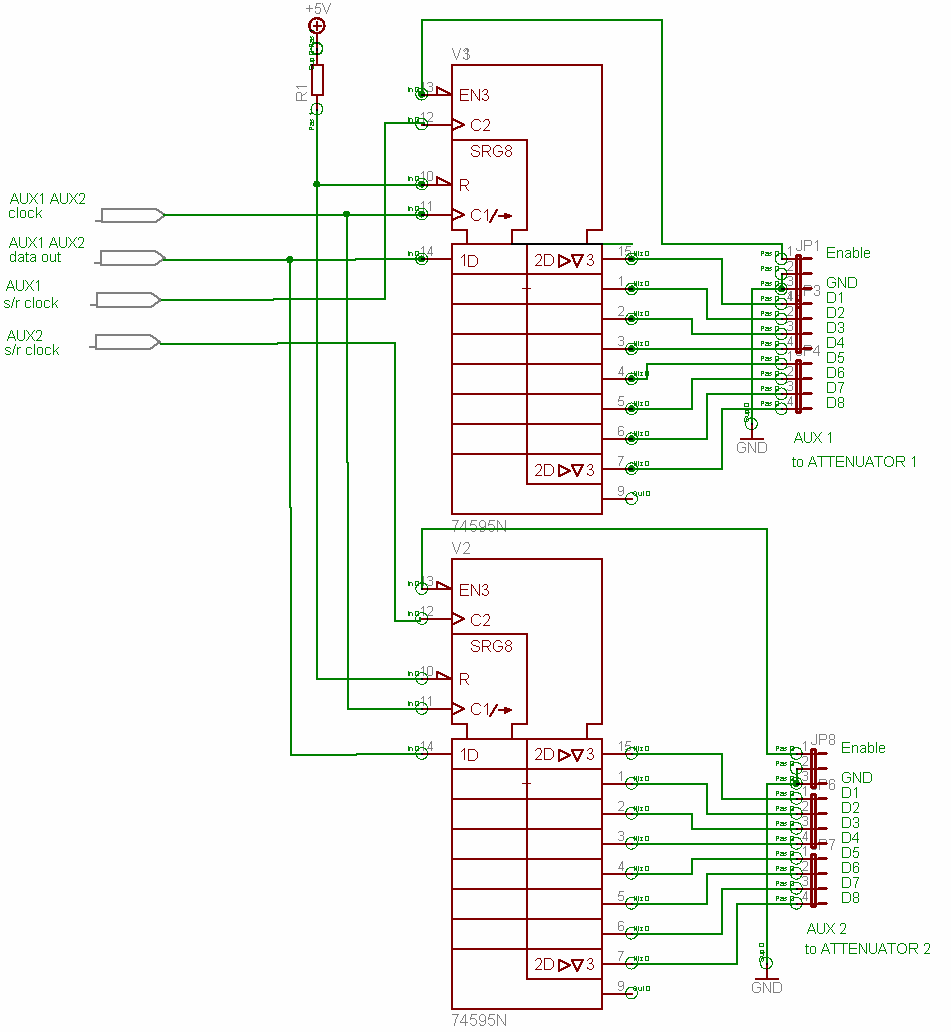 AUX1, AUX2 : array of 8 output (simulate 8 bistable buttons for a stepper attenuator)