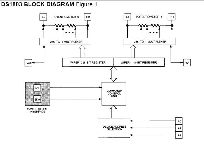 The device DS1803 is used, this component implements 2 digital potentiometer.