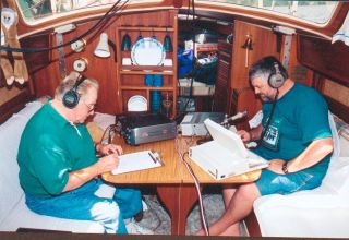 Looking down through the companionway into the interior of the sailboat, you can see the operating positions on the dining table. Karl, VE3MB, is on the left at the 20M SSB station; and John, VE3LM, is on the right at the 40M SSB station. One of the challanges of operation on the sailboat is the close quarters. The table has to be folded up out of the way for sleeping, so the stations had to be torn down during rest period.