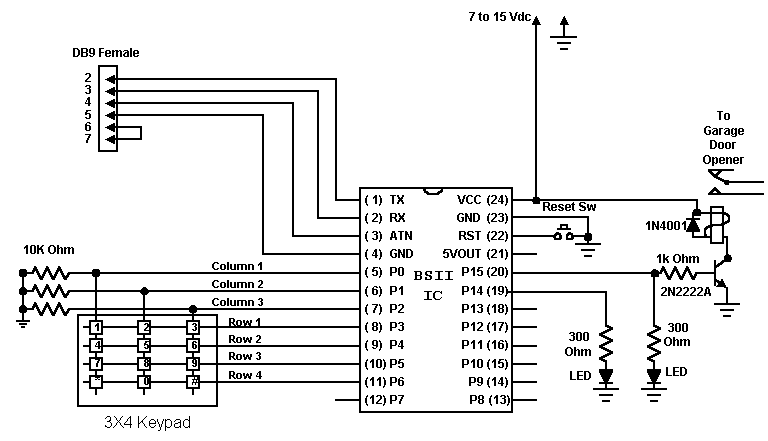 This program and a BSII IC will make a keypad entry for a garage door opener. The original code was written by Jim Steinman for a BS1 IC and modified by me to work on a BSII. The code is heavily commented by both of us and contains construction notes.