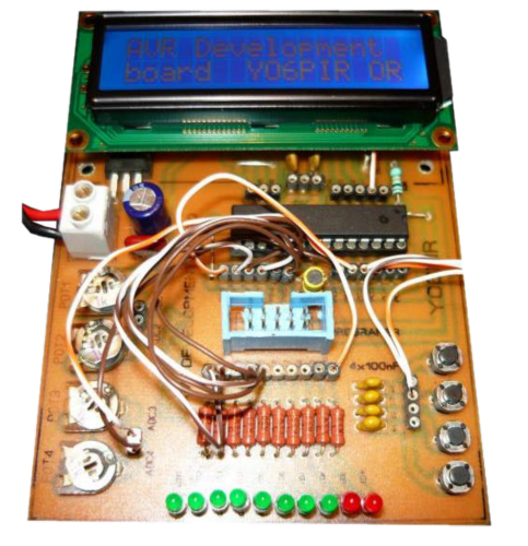 AVR-Developement Board Placa de dezvoltare programe cu microcontrolere AVR. Include adaptare la LCD si LED-uri de test precum si butoane si soclu pentru procesor uzual AVR Atmega8,328. |