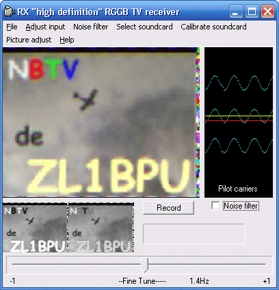 This suite of programs enables low and modest resolution B&W and colour TV images to be transmitted at modest power, and received via a limited performance HF radio channel. The system has been optimized for specific radio conditions; there is a version for NVIS conditions (such as the Amateur 80m band at night); another with better resolution, more suited to higher bands; and a special fast version for VHF. The pictures are easily tuned with practice, and can be recorded and replayed using software provided.OFDM NBTV is an analog technique, in fact it is a true Fuzzy design as well. The transmission technique used is quite different from conventional TV - each line is transmitted separately, but all lines are sent at the same time, on a slightly different frequency. Because the transmitter and receiver operate at precisely the same speed, controlled by the computer sound card, there is no need for any sync pulses to align the picture; in fact there is no automatic synchronizing mechanism at all - it simply isn't necessary.