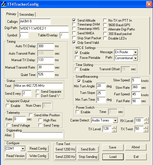 Many users are using the Byonics TinyTrakers. Below are the settings you should use if you are in a suburban area, like Chicago. (If you plan to travel to a rural area like Northern Michigan or Northern Wisconssin, you may change the DigiPath to WIDE1-1,WIDE2-2.) Substitute your callsign kc8aaa. The callsign-9 is the standard mobile identifier. Put whatever you want in the status text field. Save memory on your TinyTraker by using the same settings for the Primary and Secondary windows. You can toggle between these setting using the tabs at the top of the screen. Recieve and transmit frequency for your radio should be 144.39 MHz. It's best to include an RF choke using a ferrite doughnut on the GPS line into the tracker and/or bypass caps on the power leads from the battery and PTT-ground line on the GPS in line. TinyTrakers have RFI issues which can be mitigated this way.