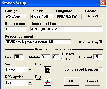 E. Under Setup->Station Setup, Complete station callsign (change WX8AAA to your callsign), latutude, and longitude. Lat/Lon in the format DD.MM.hundrethsofMM. Rural stations (more than 75 miles from another iGate station) can set the Unproto to WIDE3-3. Most stations in Chicagoland should NOT set your unproto path to WIDE3-3 because it causes unnecessary interference to an already busy APRS frequency. If outside IL, Substitute your state for IL, and if you are operating wide 3-3, change W2 to W3, otherwise just leave it alone. Also, change EN62dc to your grid square.