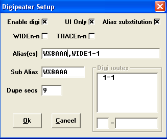 F. Under Setup->Digipeater Setup, edit your callsign in place of WX8AAA and set similar to shown below. (choose OK if prompted before below dialog box appears)