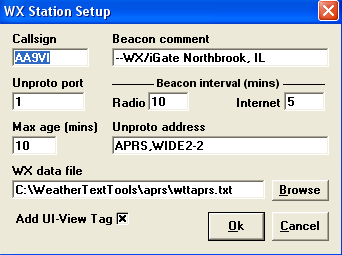to get a USB to serial adapter, if nexessary. B. On the Ultimeter 2100, go into Data Logger Mode by pressing the -0- and the anemometer button at the same time. Hold for 3 seconds, until display stops flashing. C. Open WeatherText Tools program. Go to Connect->Connect and Receive Weather Text. D. In WeatherText Tools go to APRS->View APRS String. E. Open UI-View. Go to Setup->WX Station Setup. Use similar settings shown below, but change the beacon comment to your preference and the callsign to your own.