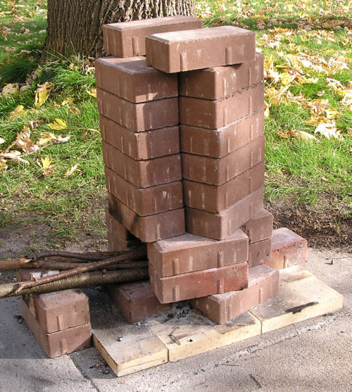 I decided to try making a stove from brick, as brick can be obtained almost everywhere. As in the previous design, the retail cost is under ten dollars. The "paver" bricks that I used are available at most large hardware or landscaping supply stores in this country. They are often on sale, especially in the summer, for 30 to 40 cents apiece. Hand-made bricks could be used also. They may not last as long as fire brick, but these stoves don't need to last for years. After trying a few different combinations, I settled on the design on this page. It can be assembled in a matter of minutes. Another course or two of bricks in the chimney couldn't hurt. This stove has much more thermal mass than earlier designs and will take a little longer to heat up, but it will keep the coals hot and retain heat for quite a while after the fire goes out.