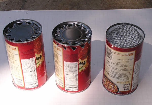 I decided to try the same kind of design with some "tin" cans, which of course are steel. The cans used were 26 oz. Hunts spaghetti sauce cans. Using a hand can opener, I cut holes in the bottom, holes in the side plus bottom, and one with the bottom removed and covered with hardware cloth. The two with the best air flow lit the fastest and worked the best. See pictures below. As ash covered the bottoms of the cans, the center stove, with holes in the side, worked the best, as the side holes were still mostly open.