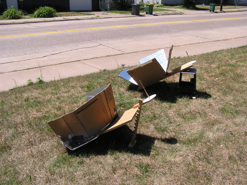 This design was very easy to build, could be made larger or smaller, and seems pretty efficient. The angle adjustment has been simplified down to a board and something to prop up one end (Like a box) that can be slid back and forth as needed. If the reflector sides had triangular corner sections added, like the previous design, or were changed from straight to a trapezoid shape (Where the reflector edges would meet), the reflector area could be increased without a larger ground "footprint". The cardboard pieces could be glued or nailed to the board instead of using bolts like I did. The reflectors could be made longer (With a decreasing angle from vertical). Any increase in the size of the reflector area will increase the energy captured. It would work best with little or no wind to rob heat.