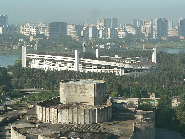 Pyongyang is North Korea's capital and showpiece. Americans are typically housed at the Yanggakdo Hotel, a property on an island that is an easy place to confine foreigners to. We were allowed to walk around the hotel grounds but were forbidden from crossing the bridge into the city when not accompanied by a guide. My first instinct was that the North Koreans might try to hide the city from our prying cameras and give us rooms with little or nothing to see, but the opposite was true: they made sure we were deposited in rooms with the best possible view. At first I was tentative taking pictures from my hotel window, but after a few minutes I relaxed. In a country as tightly-controlled as North Korea, I reasoned that there wasn't anything visible from my hotel window that they didn't want me to see.