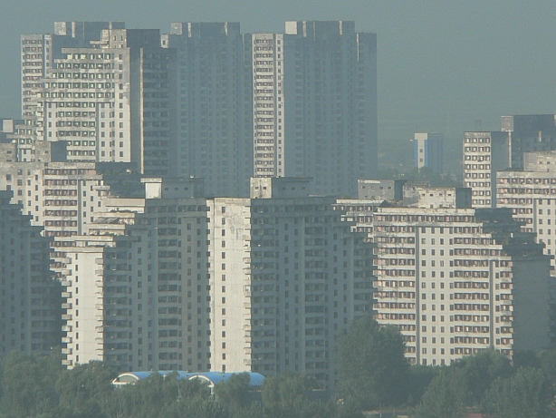 The view straight out my window. The twin-tower building is the Koryo Hotel.
