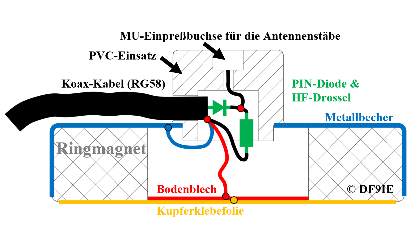 Hier nochmals der Hinweis, daß „Kauf-Antennen“ ohne Modifikation nicht verwendbar sind: Bei jeder der 4 Antennen müssen PIN-Diode(n) und eine Drossel im Fußpunkt eingelötet werden, siehe Schaltplan von PA8W!