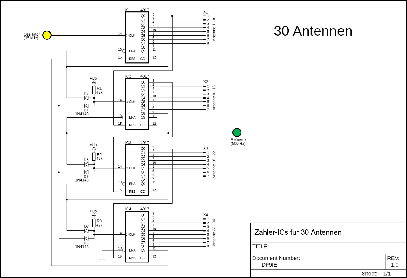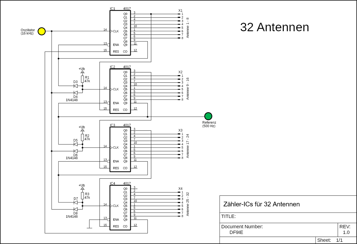 - In Stellung 4 Antennen (so wie es im Plan eingezeichnet ist) werden die mit einem Kreis markierten Antennen auf die ersten 4 Ausgangs-Pins des Zählers geschaltet.