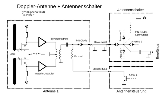 Das Antennenfeld eines Doppler-Peilers besteht aus mindestens 3 Antennen, die kreisförmig angeordnet sind. Eine Steuerung verbindet die Antennen zyklisch über einen Antennenschalter nacheinander zum Empfänger – Somit ist immer nur eine Antenne „aktiv“.