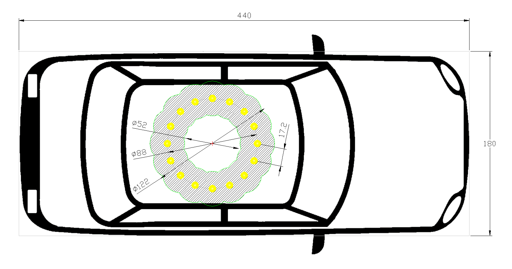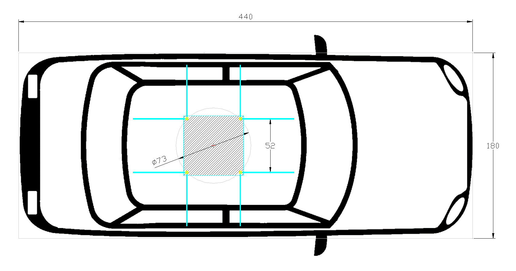 Um den Doppler-Hub und auch die Peilgenauigkeit möglichst hoch zu haben, setzt man die 4 Magnetfußantennen an den Rand des Autodachs. Bei einem „normalen“ PKW wäre ein sinnvoller Antennenabstand a = 88 cm. Damit erreicht man einen „Antennenkreisdurchmesser“ von 1,24 m, siehe die Skizze einer mobilen 4-fach-Magnetfußantenne fürs 11-m-Band.