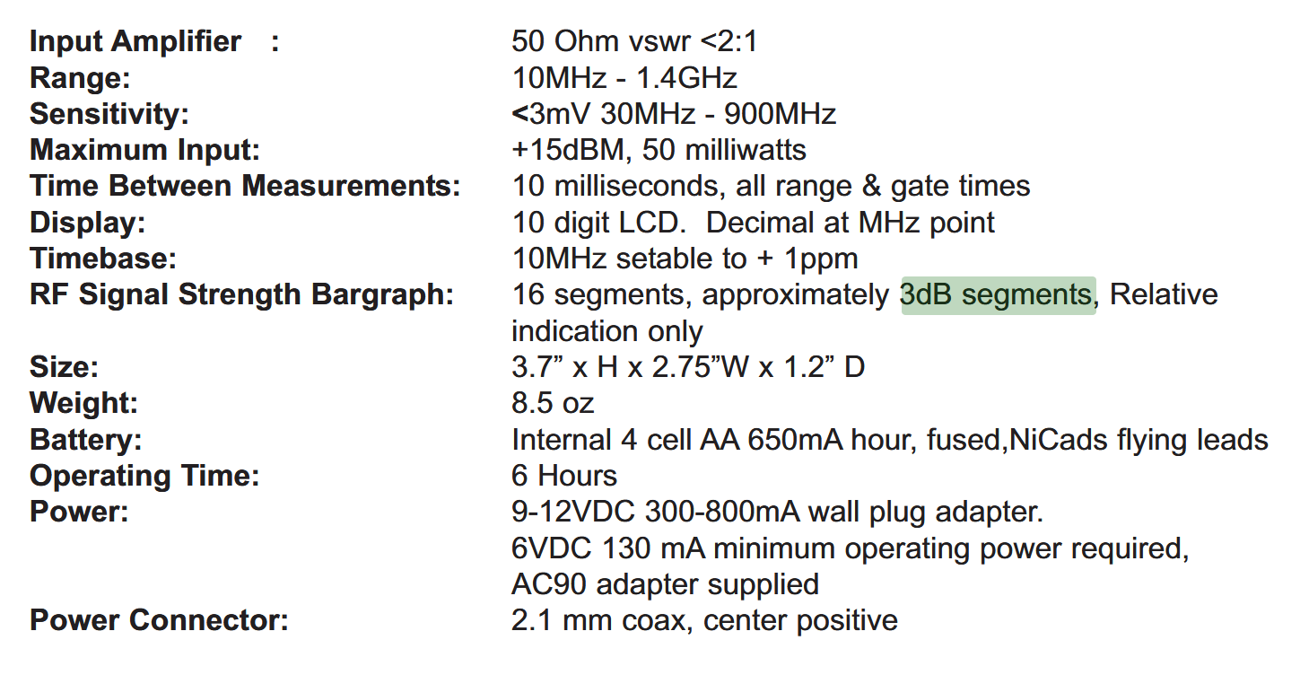 Die Grenzempfindlichkeit liegt laut Datenblatt bei 5 mV (an 50 Ω). Mit einem Referenzwert von 5 µV für S9 entspricht dies S9+60dB (siehe Tabelle). Man muß also schon ziemlich dicht am Sender sein, damit der Frequenzzähler überhaupt anspricht.