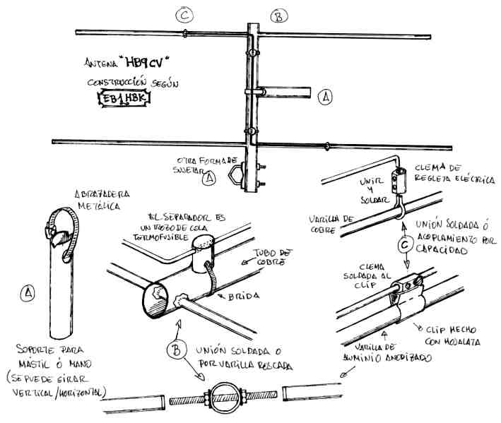 Si los elementos son de aluminio no podremos soldarlos. Y si ademas el aluminio está anodizado no permite establecer contacto eléctrico a no ser que retiremos el recubrimiento anodizado que protege la superficie. La solución escogida, y que corresponde a la antena que aparece en las fotos, consistió en relizar unas "grapas" o clips de presión en hojalata. Sobre estos clips van soldadas en posicion tumbada unas clemas de regleta de electricista. Estas clemas permiten con su tornillo de presión deslizarse adelante y atras a lo largo del elemento y conductor de alimentación para escoger el punto óptimo de acoplamiento (ver punto C).