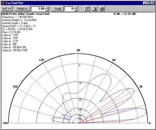 Es particularmente interesante observar como se modifica la ganancia (mucho mas elevada) y diagrama de radiación de la antena a diferentes alturas sobre el suelo, como se señala en los gráficos del final.