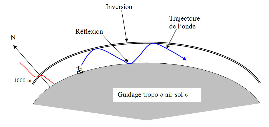 - Le phénomène de "guidage" est un phénomène extrême résultant d'une très forte inversion. Cette inversion se produit à une altitude beaucoup plus importante typiquement entre 450 m et 1500 m et peut aller jusqu'à 3000 m. Ces inversions ne sont pas engendrées par le phénomène nocturne vu précédemment mais par des phénomènes météorologiques particuliers (hautes pressions, front d'air chaud, vents chauds, etc..). L'inversion se produit alors aussi bien de jour que de nuit (bien que plus intense la nuit) et n'est pas influencée par la nature du terrain. Les ondes sont "guidées" le long de ces zones d'inversion intenses (nous avons expliqué précédemment que les ondes s'incurvent vers les indices les plus forts). En théorie si la courbure de l'onde est aussi forte que la courbure de la terre, l'onde peut se propager sur des distances infinies ... la seule limite étant la frontière du conduit d'inversion. Les masses d'airs à l'origine de ces inversions suivent en générale une forme allongée et parallèles. Les "canalisations" créées sont alors beaucoup plus directionnelles par rapport à l'amélioration tropo. Dans les meilleurs cas de figure, la zone d'inversion peut être plus étendue et moins longiligne, offrant alors une propagation omnidirectionnelle (= "pile up" !). Pour être plus précis, sur les profils d'inversion nous pouvons observer deux cas de figure : - Une seule inversion : Dans le premier cas le phénomène d'incurvation de l'onde est similaire à l'amélioration tropo mais beaucoup plus accentué. Le "guide" ainsi créé se situe entre le sol et l'inversion. Selon l'intensité de l'inversion l'onde peut retourner vers le sol et se retrouver réfléchie. Ainsi elle va faire des "bonds" entre la couche d'inversion et le sol. la largeur du guide est l'altitude de l'inversion, typiquement de 500 à 2000m. A cause des réflexions sur le sol l'affaiblissement est en 1/d². A noter que la perte en réflexion est plus faible sur une surface humide, le cas idéal étant la mer. - Deux inversions: Dans le deuxième cas le "guide" est compris entre les deux inversion, une sorte de tube de masse d'air humide sur laquelle l'onde s'enroule et se propage à la manière d'un guide d'onde (ou comme dans une fibre optique). La largeur du guide est plus faible et peut aller de quelques mètres à une centaine de mètres. Du fait que l'onde ne rencontre aucun obstacle, l'affaiblissement est en 1/d soit beaucoup plus faible. C'est pour cela que ce mode de guidage peut amener à des signaux "extrêmes".