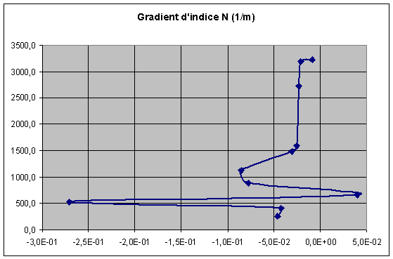 Ce qui est très intéressant est d'observer que ce sont les variations de Nh qui sont prépondérantes. Ainsi la variation d'indice est du principalement à un effet d'humidité de la masse d'air. L'inversion représente ici une variation de N de 20 et un gradient de 0.27 m-1 pour Trappes et une variation de 40 et un gradient de 0.6 m-1 pour Emden. Il est intéressant de constater la complexité de la prédiction des phénomènes d'inversion tropo. En effet l'humidité de l'air est un phénomène beaucoup plus complexe que la pression et la température et dépend très fortement des conditions météorologiques. Le comportement de la vapeur d'eau est aussi limité par la pression de vapeur d'eau saturante etc... Courbure de l'onde Le rayon de courbure d'une onde traversant un milieu présentant un gradient d'indice constant est donné par la formule suivante: 1/rayon = - dn/dh = - 10-6 * dN/dh Nous en déduisons le gradient d'indice de réfractivité nécessaire pour obtenir un rayon de courbure égal à celui de la Terre : dN/dh = -157unités/km . Ainsi si le gradient est plus fort que -157/km l'onde s'incurve suffisamment pour "rejoindre" le sol. Le gradient d'une atmosphère "standard" de -40/km vue précédemment n'est donc pas suffisante. Par contre les gradients atteints sur les sondages et en particulier celui de Emden-Flugplatz à -600/km mettent très nettement en évidence le phénomène de propagation.