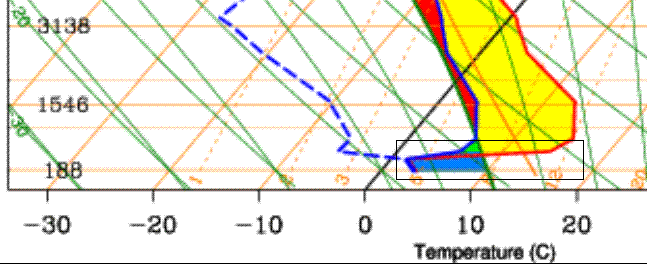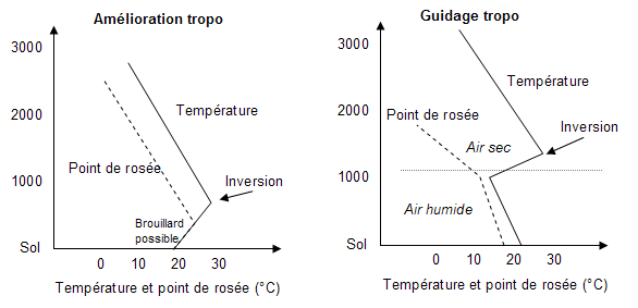 Pendant l'ouverture tropo nous avons: - beaucoup de jaune : air sec en altitude - air froid et humide en basse altitude - un gradient de température très important : variation très brusque de la température. Cette inversion survient à une altitude de l'ordre de 500m à 1000m.