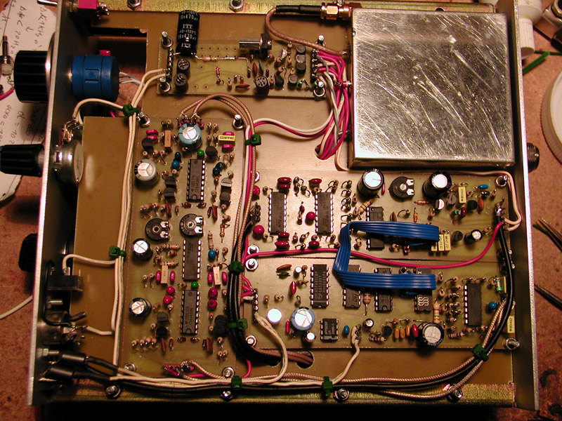 Par expérience sur le mélangeur TX, le résidu d'OL est de l'ordre de -50 dBm. Ainsi pour du conduit cela nous ramène à 90dB pour le reste des chemins de fuite. Une telle isolation n'est pas évidente à obtenir en utilisant une technologie "classique" à l'aide de boîtiers Schubert. Quand à la valeur du décalage doppler il est donné par : 2*f*v/c avec v la vitesse de l'objet réfléchissant. Si par exemple v = 20 km/h nous avons : 2*2300*106*20*1/3600*1/300000 = +-85 Hz. Ce décalage est suffisant pour "sortir" du notch à w0 et donc être facilement audible. Conclusion Solutions : blinder, encore blinder et rigidifier la mécanique, absorber les chocs mécaniques. La maîtrise du blindage CEM est un aspect FONDAMENTAL pour le succès d'un design zero FI. De ce fait la mise au point d'un tel récepteur n'est pas à la portée d'un débutant! J'ai du pour cela utiliser des joints souples CEM afin de garantir une fuite minimale entre les étages d'OL et les étages de réception. A l'avenir je pense utiliser des boîtiers d'une technologie différente offrants une meilleure efficacité de blindage. En effet les boîtiers Schubert ont trop de fuite à cause de l'espacement inévitable entre le capot et les parois du fait de l'effet de bombage inévitable du capot. Bien sur il est possible de souder le capot aux parois sur toute leur longueurs mais ensuite plus question de dessouder pour accéder à l'intérieur du boîtier!!! Le mieux, de loin, est d'utiliser des boîtiers usinés avec des capots vissés ou munis de fingerstocks.