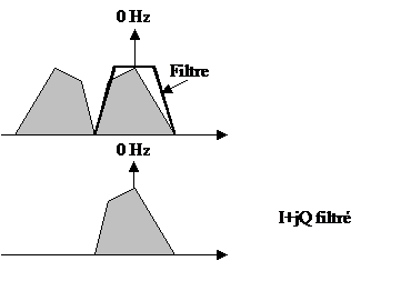 - La bande latérale se retrouve donc repoussée sur une moitié positive ou négative du spectre. Un filtre passe bas de 1,2kHz sur chaque voie I et Q suffit alors à l’éliminer facilement. Un tel filtre est beaucoup plus facile à réaliser en BF (RC et amplis OP) que sur une FI (filtres à quartz) d’ou l’intérêt de la méthode. A l’issu du filtrage une seule bande latérale est conservée, supérieure ou inférieur selon le sens du décalage de fréquence précédent (le sens du phaseur). Notez que le spectre n’est pas symétrique car nous travaillons avec des signaux complexes et non pas réels. C’est l’intérêt de travailler avec une représentation complexe des signaux.