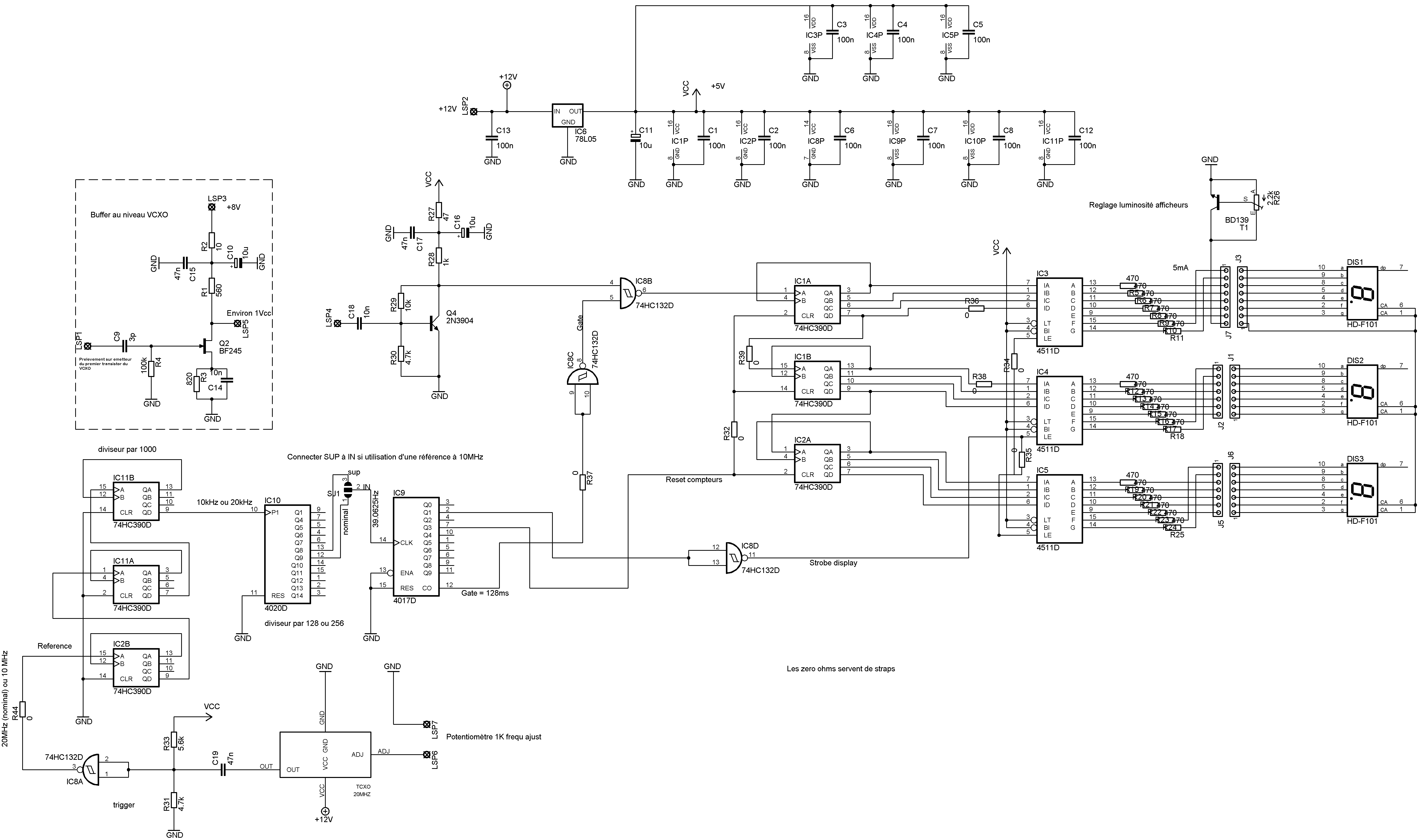 Stabilisation thermique et mesure de fréquence Par rapport au design d'origine S53MV, j'ai rajouté les deux fonctions suivantes, fortes utiles: - stabilisation thermique du Quartz afin de raccourcir très significativement la durée de stabilisation et pour obtenir ensuite une bonne stabilité à long terme. Ceci a été réalisé par un circuit d'asservissement en température. Voir le schéma ci dessous. Le LM335 et le 2N2905A sont en contact thermique très étroit avec le boîtier du quartz. Grâce à cette régulation, la durée du warm-up est < 10 minutes et la stabilité excellente (< 500 Hz / Heure). - un fréquencemètre permettant de mesurer la fréquence sur 2,3GHz à partir du de la fréquence de sortie du VCXO à 18MHz. Le principe est fort simple, il s'agit d'un fréquencemètre dont la base de temps de comptage a été ajustée de telle façon que l'affichage renvoi les trois digits en MHz de la fréquence sur 2320MHz. La fréquence de référence est générée par un TCXO 20MHz. Afficher le schéma du fréquencemètre. (Ou faire "enregistrer la cible du lien sous" car l'image est grande). Si la réalisation vous tente vous pouvez me contacter (Cf. rubrique "Contacts").