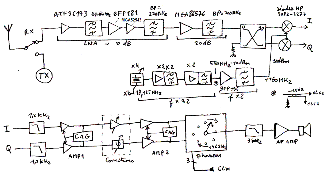 Réalisation et expérience F4BUCVoici les synoptiques des deux chaînes RX et TX. Quelques composants changent par rapport au design de S53MV, en particulier sur la partie émission (cliquer sur les images pour les agrandir et les rendre plus lisibles). La difficulté technique de mise au point a été incontestablement celle de l'isolation entre les étages RF de réception et l'OL du à un découplage insuffisant provoquant une ré-injection d'OL trop importante. Le manque d'isolation produit les deux phénomènes suivants : - microphonie avec les vibrations mécaniques de l'ensemble de la mécanique - effet doppler audible par des objets mouvants à proximité du transceiver et de l'antenne. Microphonie Il semblerait qu’une réinjection trop importante de l’OL en réception produise des problèmes de microphonie selon le mécanisme suivant : - les vibrations mécaniques du boîtier provoquent une petite modulation d’amplitude du signal d’OL réinjecté - le signal d’OL ainsi démodulé (battement nul), on retrouve cette modulation d’amplitude détectée sur les voies I et Q en sortie du mélangeur - vu que les fréquences de cette modulation d’amplitude sont des fréquences de résonance de boîtier métallique, on retrouve des composantes de qques centaines de Hz. Le démodulateur I,Q décale ces composantes autour de w0. - le démodulateur I,Q élimine la fréquence (effet notch) à w0 mais sur une bande de fréquence très faible et donc cela n’atténue presque pas le signal de microphonie. Il en résulte un son de grésillement aigu assez désagréable. - plus le niveau réinjecté par couplage parasite est important, plus l’effet microphonique est marqué. Il est donc primordial dans ce type de design de réaliser une mécanique à la fois très rigide et de blinder très sérieusement les différents étages. Le problème de blindage devient d'autant plus difficile que les fréquences sont plus élevées car dans ce cas les jonctions mécaniques tendent à fuir plus facilement. Doppler La fuite de l'OL rayonné par le transceiver est capté par l'antenne, de même que pour le résidu d'OL conduit par le câble d'antenne et rayonné ensuite par l'antenne elle-même. De ce fait tout obstacle proche réfléchit une petite quantité de l'OL qui se retrouve dans la chaîne de réception puis démodulé comme tout autre signal RX. MAIS, ce signal réfléchit subit un effet doppler induit par la vitesse de l'obstacle proche. Cela génère un battement basse fréquence qui passe le découplage DC en sortie du mélangeur et se retrouve en sortie audio par un "hululement" avec une tonalité de l'ordre de 1,3 kHz (w0) assez désagréable. En fait nous avons réalisé un radar doppler! L'effet est sensible et un simple mouvement de la main à proximité est audible. Pour se convaincre de la sensibilité du phénomène, il suffit de comparer la sensibilité du récepteur au niveau de l'OL réinjecté. La sensibilité (le MDS) est de l'ordre de -174 + NF + 10*log10(BW) # -174 + 2 + 10*log10(3000) # -137 dBm. Disons qu'il faut un S/N de 6dB pour rendre le phénomène bien audible, ce qui fait un niveau ré-injecté sur l'antenne de -130 dBm. Le niveau de l'OL sub-harmonique (1160MHz) est de l'ordre de 10dBm sur le mélangeur. Nous en concluons qu'il est nécessaire d'assure une atténuation de 140 dB entre : - le résidu d'harmonique deux à 2,3 GHz dérivé de l'OL sub-harmonique de 10dBm - et l'entrée du LNA Entre les deux signaux, il existe plusieurs chemins de fuite. Ce sont eux qui doivent assurer ces 140dB. Les chemins de fuite possibles sont les suivants: