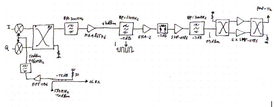 - Le traitement mathématique suivant consiste à translater notre spectre complexe à bande latérale unique sur w1 = 2320 MHz. Cela revient mathématiquement à faire l’opération (I+j.Q)*exp(j.w1.t) = I’+j.Q’avec w1 = 2320 MHz. - Maintenant que nous avons un signal transposé sans image sur 2320Mhz c’est bien mais il est complexe. Comment se ramener à un signal réel ? Et bien en prenant la partie réelle de I’+j.Q’. Réécrivons I’+j.Q’: (I+j.Q)*exp(j.w1.t) = (I+j.Q)*(cos(w1.t)+j.sin(w1.t))=I.cos(w1.t)-Q.sin(w1.t)+j.(I.sin(w1.t) + Q.cos(w1.t)). Nous voyons donc qu’il faut réaliser la fonction matérielle suivante : I.cos-Q.sin pour trouver la composante réelle. - Cette fonction se réalise concrètement avec un mélangeur en quadrature. Ce mélangeur est composé de deux mélangeurs drivés en phase, l’un produisant I.cos(w1.t) et l’autre Q.cos(w1.t). Ensuite un coupleur hybride réalise l’addition des deux tensions AVEC un déphasage de 90 degrés sur une voie, d’ou l’utilisation (astucieuse) d’un hybride 90°. On a donc : I.cos(w1.t) + Q.cos(w1.t +pi/2) = I.cos(w1.t) – Q.sin(w1.t). Le tour est joué! - L’intérêt en hyper est de pouvoir réaliser facilement ce coupleur hybride. Il faut par contre prendre soin de la symétrie des deux mélangeurs.