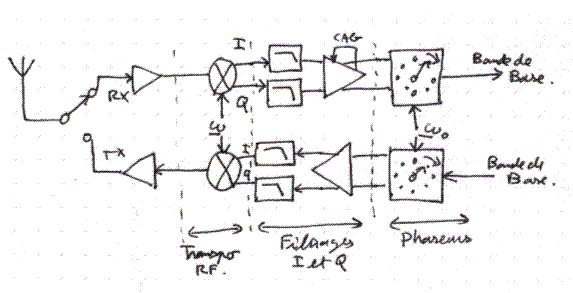 Principe de la chaîne de réceptionIl suffit de reprendre le fonctionnement de la chaîne d'émission mais à l'envers! Le mélangeur RF produit les voies I et Q en bande de base. Un filtre passe bas permet de rejeter les signaux adjacents, c'est lui qui détermine la sélectivité en réception. Les amplis des voies I et Q en bande de base comportent des corrections sur l'amplitude et la phase afin de régler au mieux la réjection de l'image. Une CAG est également réalisée. Enfin le phaseur en réception décale le spectre complexe I,Q et fournit sa valeur réelle, ce qui a pour effet de retrouver un signal audio. La composante DC est éliminée en sortie I et Q par un découplage capacitif. In fine cela provoque un notch en sortie audio sur la fréquence w0. Ce notch est très étroit et ne perturbe en rien la qualité audio. Par rapport aux performances d'un design superhétérodyne, les limitations du design S53MV sont: - la sélectivité qui est liée à la réponse d'un filtre actif BF. Cette sélectivité est sans doute moins bonne que celle d'un filtre à quartz (cependant sur 2320MHz le besoin de sélectivité n'est pas important car c'est rare que l'on y trouve des brouilleurs sur les fréquences adjacentes ! ) - la CAG dont la dynamique ne vaut pas celle d'un étage FI. Certains effets de distorsion et de saturations sont parfois audibles sur les signaux forts. Encore une fois sur la bande 2320 MHz n'exige pas les performances d'un récepteur décamétrique loin s'en faut! - la dynamique en intermodulation d'ordre 2 est de façon inhérente beaucoup moins bonne avec un design zero-IF qu'avec un design hétérodyne. - à fort signal, qu'il soit utile ou parasite dans la bande de réception (qui est large ici dans un design no-tune) il se produit un phénomène de détection d'amplitude dans le mélangeur. Le signal produit étant basse fréquence il passe par les étages zero-IF et se traduit directement par un parasite audio En résumé ce design est difficile pour obtenir les perf nécessaires en bande HF (voir les designs KK7B), mais en hyper, ce qui est notre cas ici, les performances du design sont largement suffisants. Je l'ai constaté au cours des nombreux QSO que j'ai pu réaliser. Je pourrais même dire que la "tonalité" audio est assez particulière mais ne perturbe en rien la compréhensibilité des petits signaux. Ce récepteur est "qualifié", testé et approuvé par F4BUC!