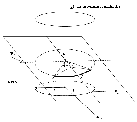Le calcul graphique de notre géodésique revient alors à projeter le segment AB sur la surface du paraboloïde à partir d'un point noté a situé sur l'axe OZ (axe de symétrie de révolution).