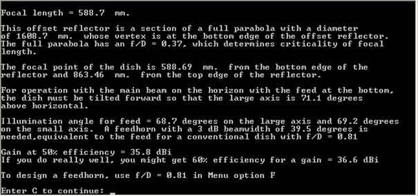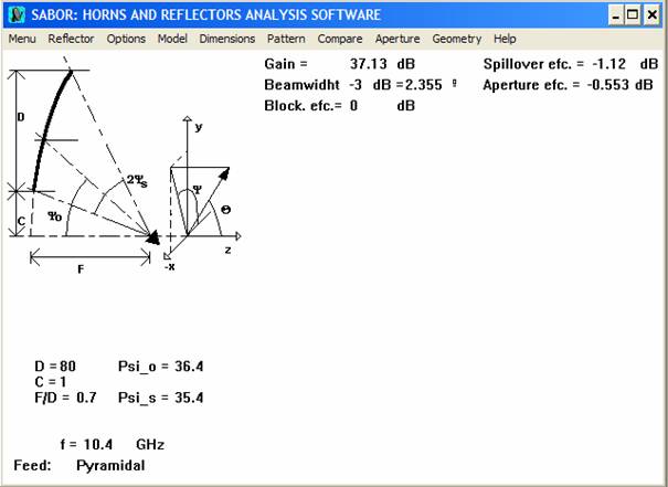 La valeur du F/D a du être modifiée un peu pour retrouver les bonnes valeurs d’angles. D représente le diamètre du cylindre qui coup le réflecteur parabolique pour former l’offset (géométriquement équivalent à l’intersection avec un cône de sommet le foyer). Perte spillover + aperture (illumination) = -1.12 -0.55 = -1.67dB soit un rendement de 68%.