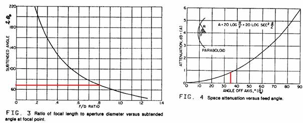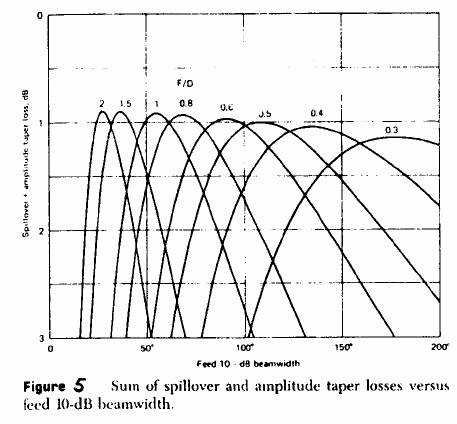 L’erreur acceptable sur l’angle d’ouverture de la source est donnée par les courbes suivantes : (de DK2RV, DUBUS 1/1986) On voit qu’il faut respecter l’angle à +-5 ° pour un F/D de 0.8