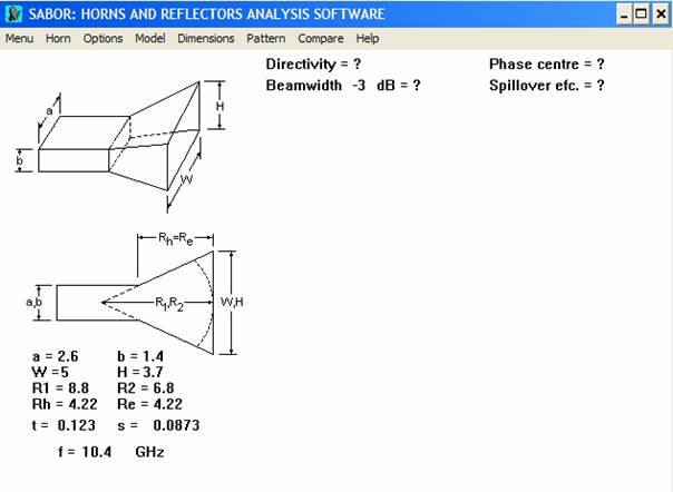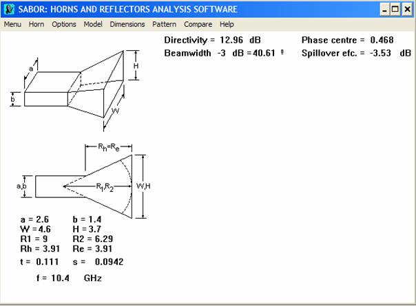 Le design plus précis du cornet pyramidal est réalisé sous SABOR. On rentre d’abord les valeurs données par HDL_ANT. Attention : sous HDL_ANT axial_length = Rh (ou Re) sous SABOR !! R1 et R2 diffèrent car les rapports des dimensions H et E ne sont pas les mêmes pour le guide et l’embouchure du cornet. SABOR donne : Plan H : à -3dB 37.4° à -9.2dB 65° Plan E : à -3dB 40.6° à -9.2dB 69° Pas si mal. On ajuste un peu pour obtenir les mêmes angles d’ouverture en plan E et H. Ce design semble mieux : Il donne exactement les mêmes angles d’ouvertures pour les plans E et H. Plan H :