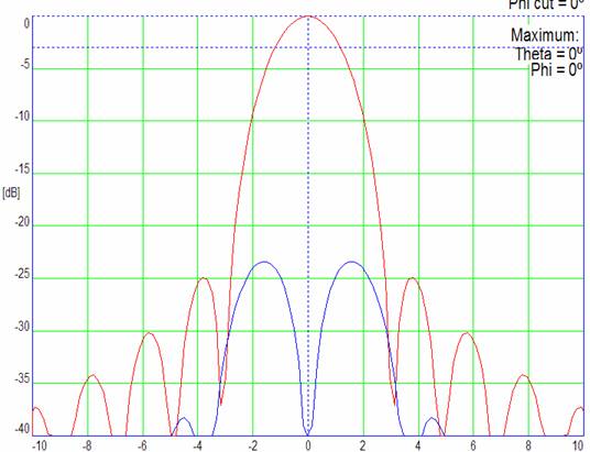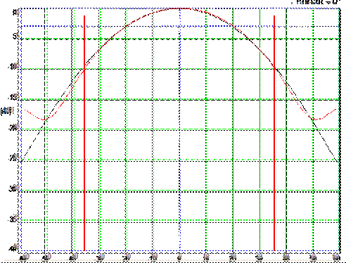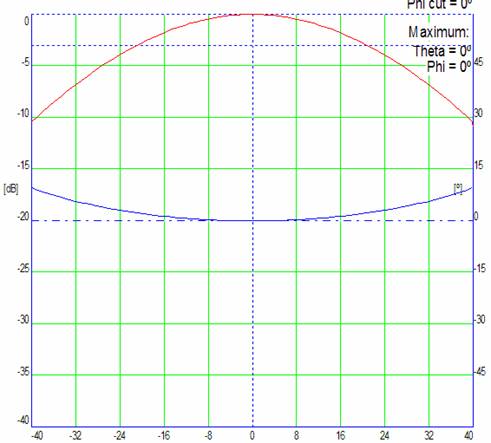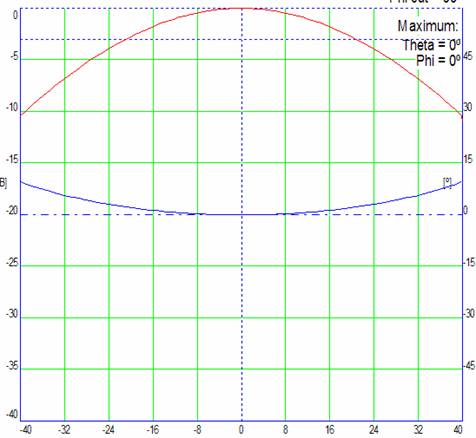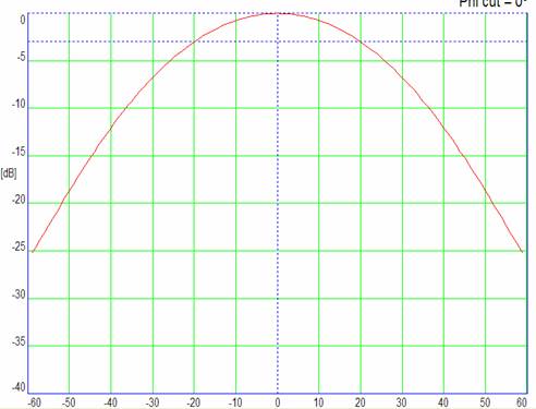 L'illumination est très bien équilibrée entre plan E et H. Parfait! A +- 42.5 cm on retrouve bien l’apodisation de 10dB. Les erreurs de phase sur les bords vont déterminer principalement les niveaux des lobes secondaires. Le diagramme de rayonnement simulé est assez propre :