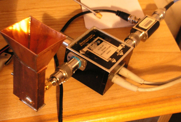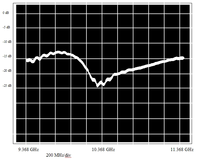 Mesure de SWRLa mesure utilise un analyseur scalaire HP. La photo montre le pont de réflectométrie. Le résultat obtenu est excellent, et ceci sans utiliser de vis de réglage. L'optimisation s'est faite en ajustant la longueur de la sonde. Les dimensions ainsi que le positionnement dans le fond du guide suivent les valeurs de W1GHz publié dans QEX de Novembre/Décembre 2006. Le return loss mesuré est de -25 dB à 10368 Mhz. Étude de l’effet de l'erreur de positionnement de la source