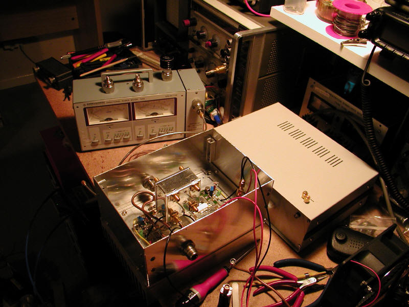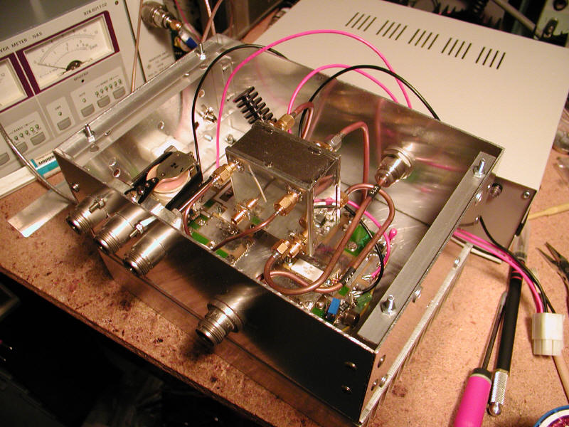 PA 1.2GHz à deux MRF286Le MRF286Les transistors utilisés sont deux LDMOS de référence MRF286. Ces transistors ont été conçus par MOTOROLA pour l'amplification dans le domaine GSM. Leur application s'étend jusqu'à 2 GHz ou ils présentent un gain typique de 11dB et un rendement de 43% pour une puissance de 60W en sortie. Ils sont conçus pour un fonctionnement en classe A ou AB. Ils sont donc directement applicables à la bande amateur 1,2GHz en BLU. L'autre qualité du MRF286 est sa très bonne stabilité thermique et sa faculté à supporter une désadaptation importante jusqu'à 10:1 de VSWR à pleine puissance. De ce fait les risques d'utilisation du transistor sont limités. Schéma de principeDeux MRF286 sont montés en parallèle. Le couplage des deux étages est réalisé par des coupleurs de type hybrides 90°. Le principe est somme toute fort simple et des plus classique. Détails de réalisationAmplificateurLes transistors et les PCB sont montés directement sur la surface d'un radiateur en aluminium poli. Un peu de graisse thermique a été insérée entre la semelle des transistors et le radiateur. Je n'ai pas mis de calle en cuivre entre le PCB et le radiateur. Par contre le vissage du circuit imprimé sur la masse du radiateur est soigné afin d'assurer le meilleur contact électrique possible pour le retour des courants HF. Le PCB et le schéma sont ceux issus de la description de F5EFD. Chaque entrée et sortie des deux étages sont reliés aux coupleurs par du semi-rigide. L'extrémité des semi-rigides sont soudés à des petites cales en laiton percées et visées au radiateur (voir photos). Les condensateurs utilisés en entrée et en sortie sont de type "porcelaine" (c'est à dire fabriqués avec une céramique de grande qualité, de la série CHA de Tekelec dans mon cas). Voir photos. Cela est important pour garantir la tenue en puissance et les qualités RF. Les trois diodes en série du circuit de polarisation ne sont pas reliées thermiquement aux transistors. Mais pour l'instant cela fonctionne très bien ainsi! Pour le refroidissement, un ventilateur est appliqué sur le radiateur et il fonctionne en permanence. De manière générale il ne faut jamais hésiter à voir les choses en grand point de vue refroidissement. Le but étant de diminuer le plus possible la température de jonction du transistor. Cela permet de garantir une bonne durée de vie et une bonne stabilité thermique du transistor (et donc de la puissance). Coupleurs : Le premier, celui d'entrée est réalisé en semi-rigide 50 et 70 Ohms tandis que le deuxième en sortie est réalisé sur téflon (PCB acheté il y a longtemps chez DC3XY).
