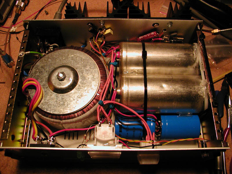 AlimentationL'alimentation est conçue de la façon suivante: - un transformateur torique de 300VA La protection sur la ligne secteur est effectuée par un fusible temporisé. Il est important d'utiliser un fusible de type temporisé (ou à fusion lente) afin que ce dernier supporte la pointe de courant transitoire causée par le transformateur. En effet, tout transformateur, même si son secondaire n'est pas chargé, va présenter un courant transitoire important lors de l'application de la tension aux bornes de l'enroulement primaire. Cela vient de l'établissement du champ magnétique dans le noyau. L'intensité du phénomène est également liée à la phase de la tension à l'instant de la mise sous tension et de la magnétisation résiduelle du noyau laissée à l'instant de la dernière coupure. Pour des transformateurs de 300VA, la règle générale est de disposer d'un fusible temporisé. Pour des transformateurs de puissance supérieures, le courant transitoire étant plus important, un circuit de soft start devient nécessaire (connexion temporaire d'une résistance en série sur le primaire). [En projet] La charge des condensateurs de lissage (32000 uF sous 45V) procure également un appel de courant important lors de la mise sous tension. D'autre part il est préférable de charger de façon douce les condensateurs pour préserver leur durée de vie. Pour ces deux raisons un circuit de charge douce a été ajouté entre le pont de diodes et les condensateurs. Il s'agit de limiter durant quelques secondes (3 à 4 s) le courant d'appel en mettant en série une résistance de 18 Ohms a travers de laquelle vont se charger les condensateurs. Cette résistance est ensuite bypassée par un MOSFET (IRF4905) de puissance pour le reste du temps en régime de fonctionnement normal. Le MOSFET présente alors une résistance négligeable (0,02 Ohms) qui ne perturbe pas le fonctionnement de l'alimentation. [En projet] Enfin une résistance de décharge de 3,9kOhms est disposée en parallèle sur les capas de lissage afin de garantir leur décharge (au bout de 20s) après la mise hors tension de l'alimentation (l'énergie emmagasinée est importante et un court circuit provoqué accidentellement si l'alimentation était ouverte, par un tournevis par exemple, pourrait être dangereux). RéglagesIl a été nécessaire de réduire un peu la taille des stubs d'adaptation en entrée et en sortie. Les deux capas en entrée ont été passées à 10pF. La polarisation des transistors est réglée pour un courant de drain au repos de 300mA. La tension de drain a été augmentée de 1,5V par rapport à la tension nominale de 26V indiquée dans la datasheet, cela aide un peu à augmenter le point de compression. La symétrie des deux étages est obtenue en minimisant la puissance sortant du port "isolé" du coupleur de sortie, port sur lequel est connectée la charge de 50 Ohms. Toute dissymétrie, qu'elle soit en phase ou en amplitude se retrouve par un résidu de puissance sur ce port. Pour ma part j'ai eu assez peu de réglage à effectuer, juste l'ajout d'un peu de clinquant en entrée d'un des deux transistors. La puissance perdue sur la charge n'excède pas 1W en pleine puissance de sortie. Résultats obtenus et commentaires utilesLe résultat obtenu est de 110W en sortie pour 12W en entrée. Cette puissance correspond approximativement au point de compression à 1dB, mais sur ce type d'ampli à LDMOS, le point de compression est assez « flou" (rien à voir avec la technologie AsGa dont la courbe de puissance de sortie s'infléchie beaucoup plus brutalement). Chaque étage produit environ