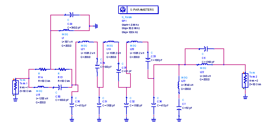 Conception des différents étagesLes filtres de bandeIl y a un filtre de bande par sous-bande couverte soit 9 au total. Ce que l'on demande à chaque filtre: - une bonne sélectivité : réjection de la fréquence image de 100dB et de la fréquence FI de 80dB (moins car le mélangeur apporte son isolation de l'ordre de 30 à 40 dB) - des pertes raisonnables, inférieurs à 2dB - une bonne adaptation d'impédance dans la sous-bande de 15dB - une bonne adaptation d'impédance vue par l'entrée RF du mélangeur aux fréquences critiques de fonctionnement du mélangeur à savoir OL, FI et image. Cette adaptation d'impédance est très importante pour garantir les perf d'intermodulation du mélangeur. - le moins de selfs possibles avec des Q raisonnables ne dépassant pas 200 - des valeurs de composants raisonnables pour les selfs et condensateurs Le design s'est orienté vers un butterworth à 3 cellules LC complétée par un diplexeur avant le mélangeur. Une trappe réglée sur la fréquence FI est disposée avant la commutation des filtres pour assurer la réjection de la FI. Chaque filtre est commuté par des relais mécaniques. Il faut absolument éviter les commutations à composants actifs du style diode PIN qui rajoutent des effets non linéaires et dégradent fortement la performance d'intermodulation du récepteur. Étude théoriqueVoici le schéma de simulation pour le filtre 14MHz.