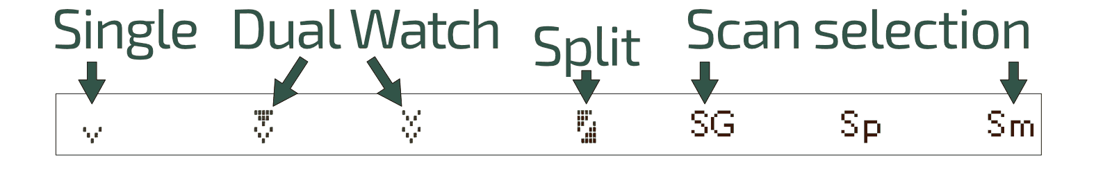 SINGLE, DOUBLE, DW LOCK, DW LINK, SPLIT (Dual Watch+Single/Dual VFO) allows two channels to be monitored simultaneously. |