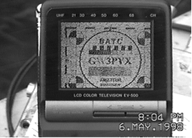 This was state-of-the-art when I bought it, but now the display looks very small and not very bright. I run it off 5V (using a SMPS from a 12V battery), and connect the audio and video in directly from my portable receiver. Despsite the picture opposite, it is a colour unit. The test card on the display was received on 3cm from Cardiff to Bristol, across the Severn Estuary.